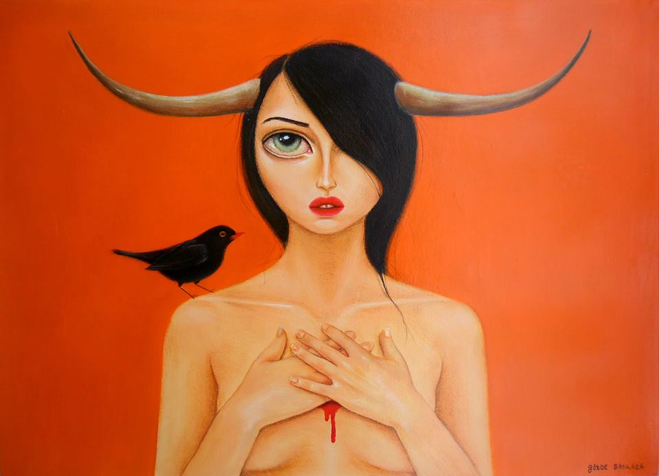 Başlangıçta göze çarpan, her ne kadar, ” renkli” bir yüzeye iliştirilmiş figürler olsa da, biraz yaklaşınca, ortak olduğunuz yalnızlığa kabul edilmek sevdasına düşüyorsunuz. Neden mi? Çünkü Baykara‘nın resimleri; göründüğünden daha büyük bir çelişkiyi barındırıyor içinde. Son derece kadınsı bir çizgi ile resmedilmiş, uysal, neredeyse iki boyutlu zeminin keskin renkleri içinde her zaman dik duran bir figür; cazibesi ve öz güveni ile çekiyor izleyeni…